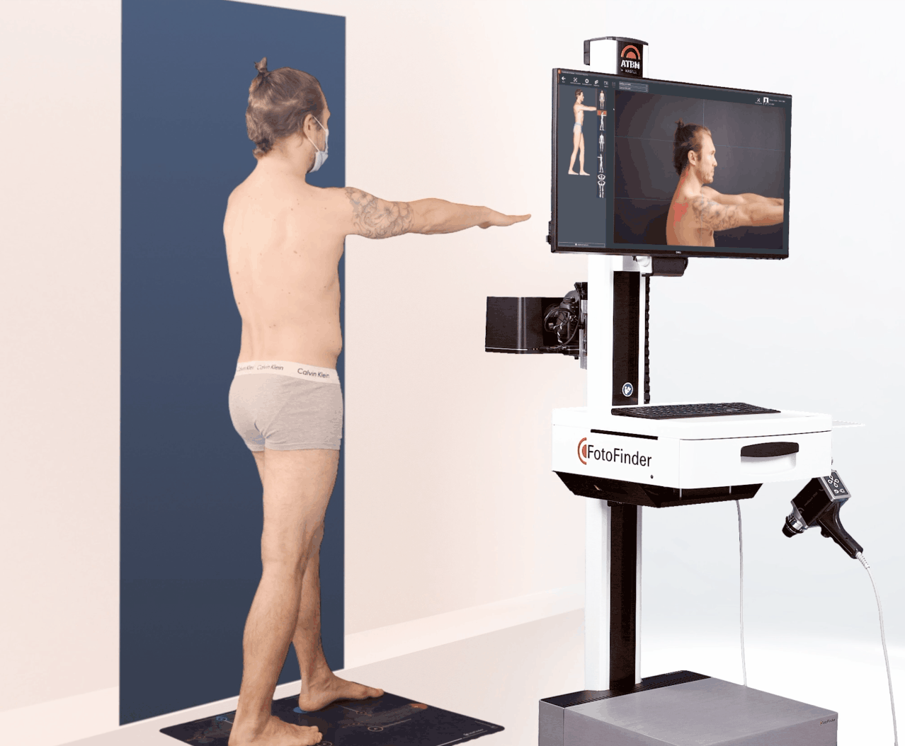 In our scanning room, you’ll undress to your comfort. Standing on a designated mat, we will guide you through a series of poses while a high-resolution camera captures images of your entire skin surface.